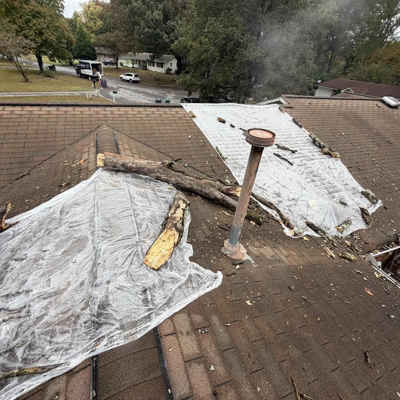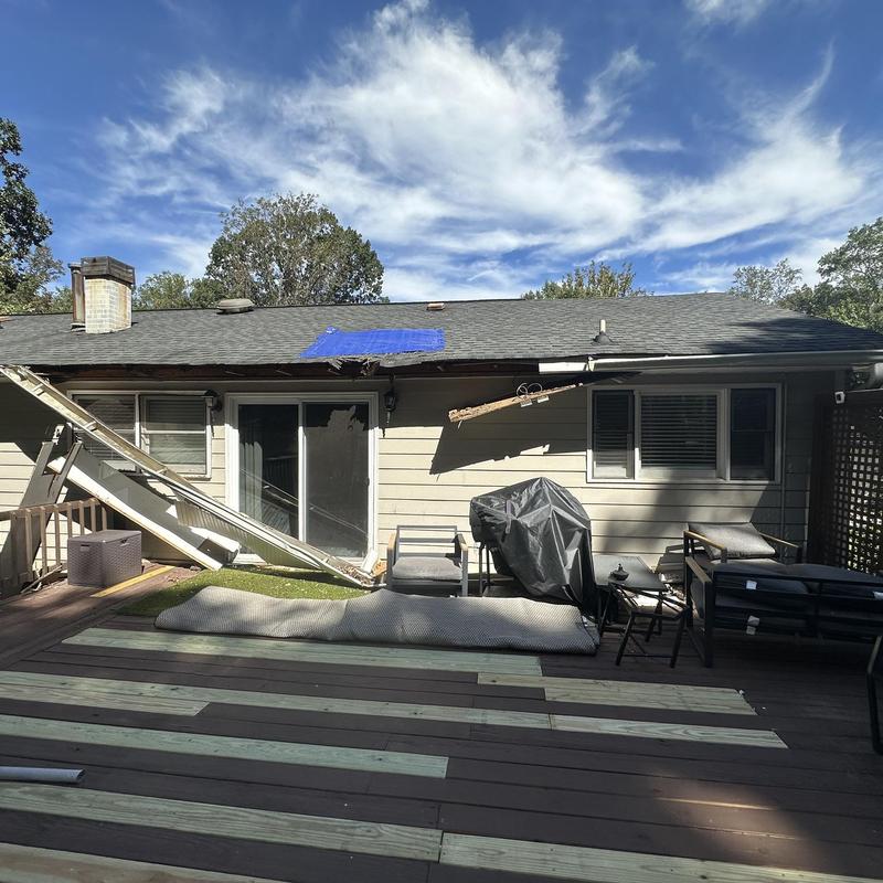 Empire Roofing and Restoration installed emergency tarps after a tree fell on a house in Smyrna, Georgia. The team secured the damaged area to prevent further exposure to rain and debris, helping to stabilize the property until permanent repairs could be scheduled.