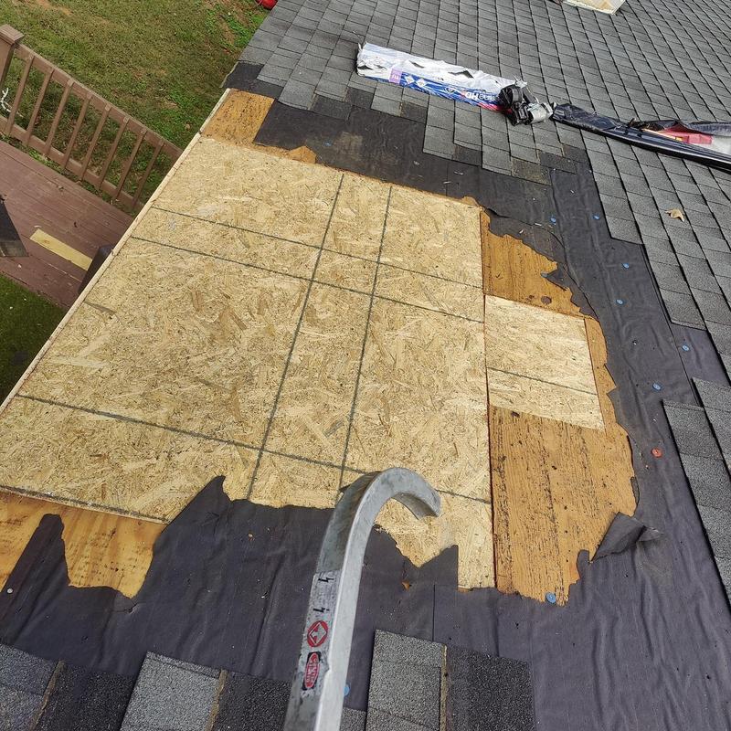 Empire Roofing and Restoration replaced damaged roof decking and shingles after a roof was blown off during an inspection. A temporary tarp was added before repairs. This roof repair service took place in Marietta, Georgia.