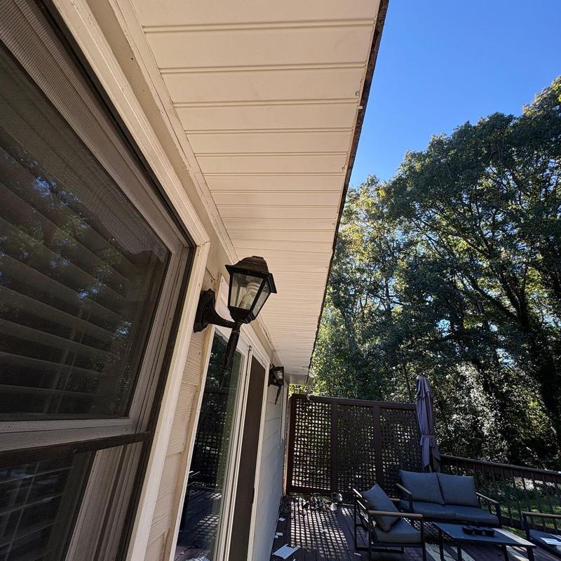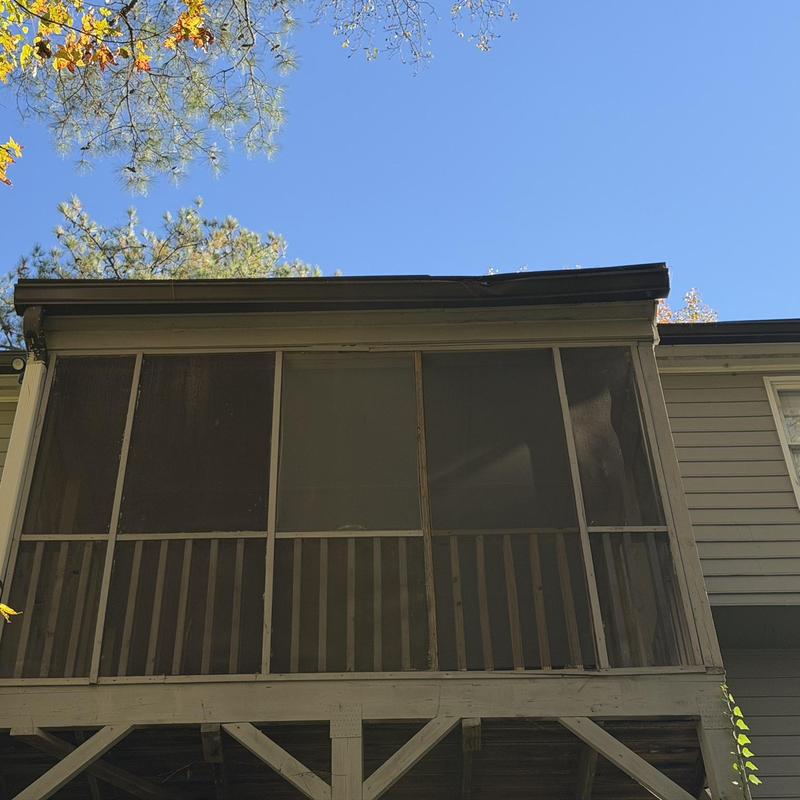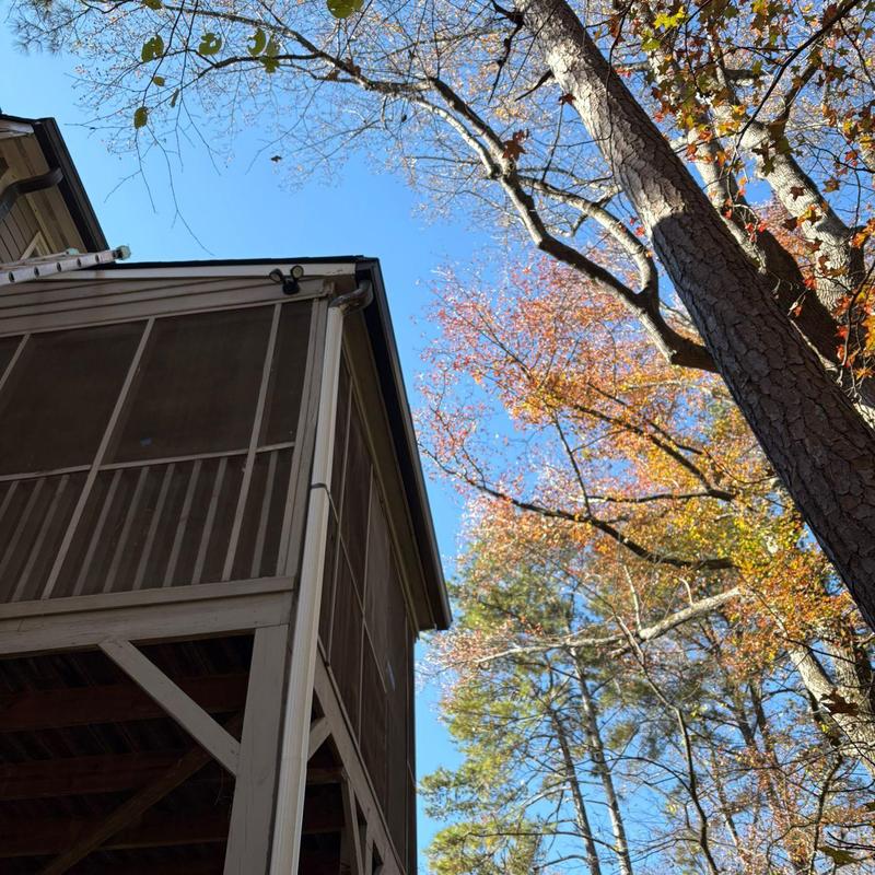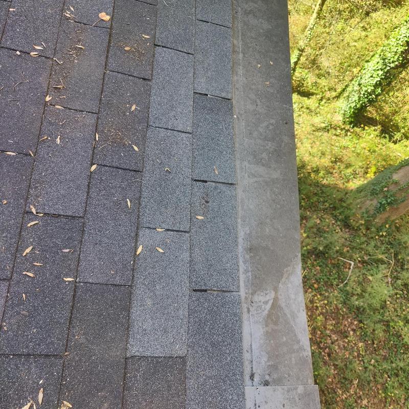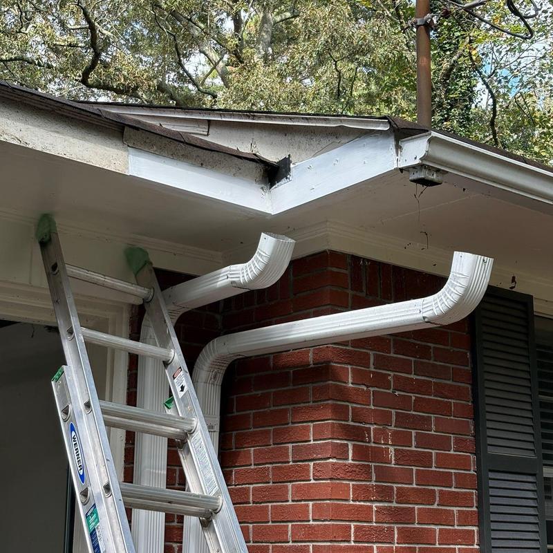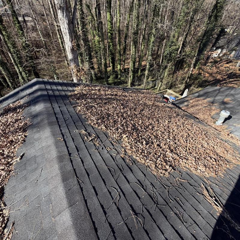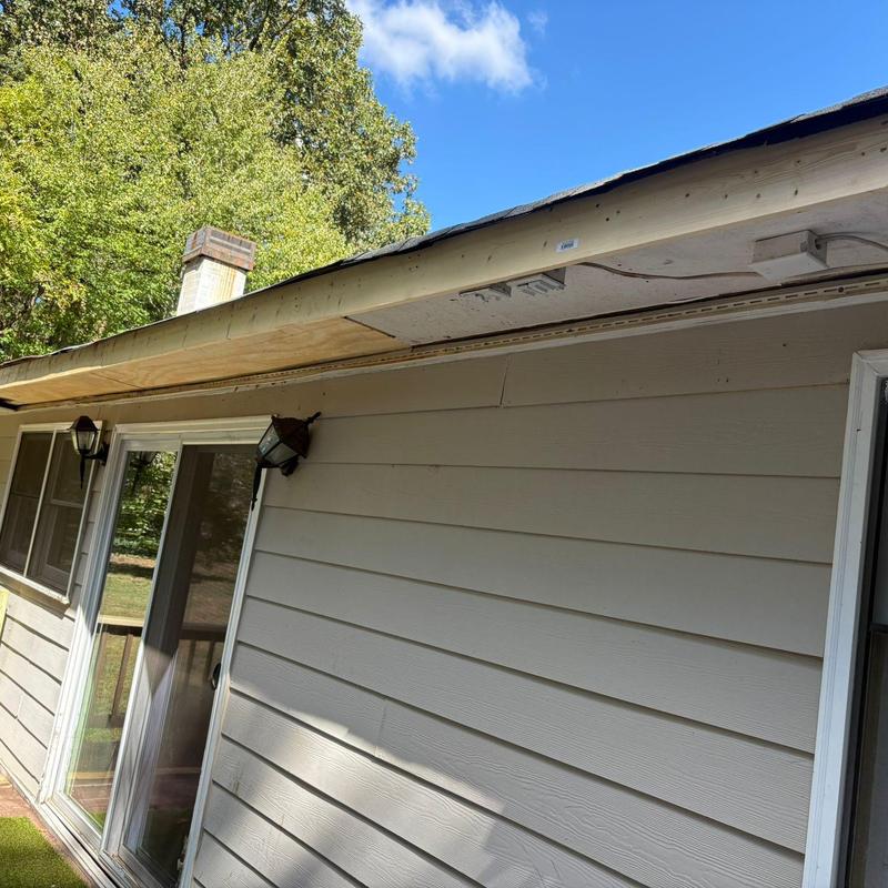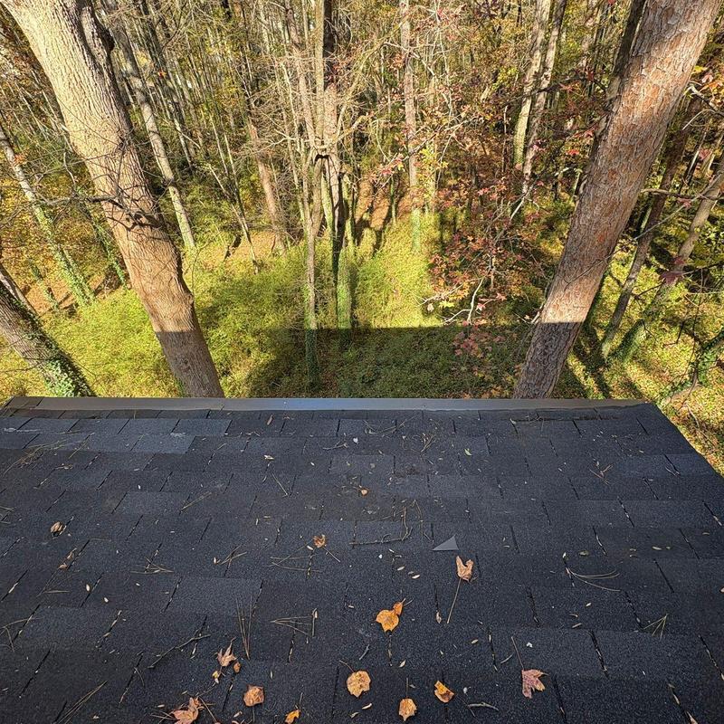 Empire Roofing and Restoration cleared debris from a roof in Austell, Georgia to inspect for hidden damage and improve drainage. The team replaced 8 feet of damaged fascia and 22 feet of white 5-inch gutters to restore proper water flow and protect the structure.