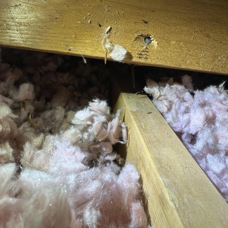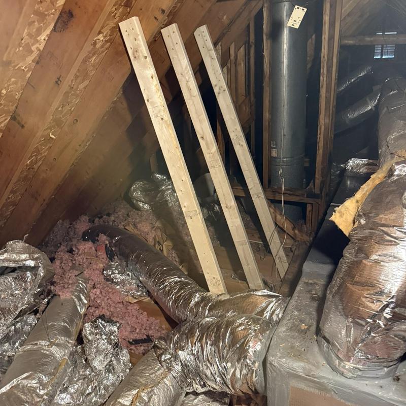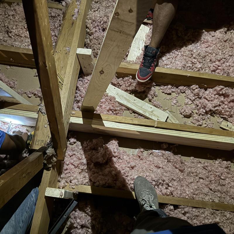 Empire Roofing and Restoration replaced six 2x6x16 ceiling joists in a bedroom in Marietta, Georgia, to fix sagging caused by a failed ceiling joist. The team removed the damaged framing and installed new supports to improve structural safety.