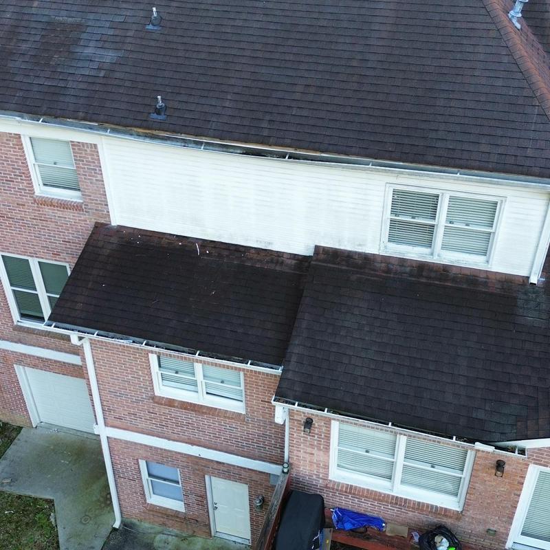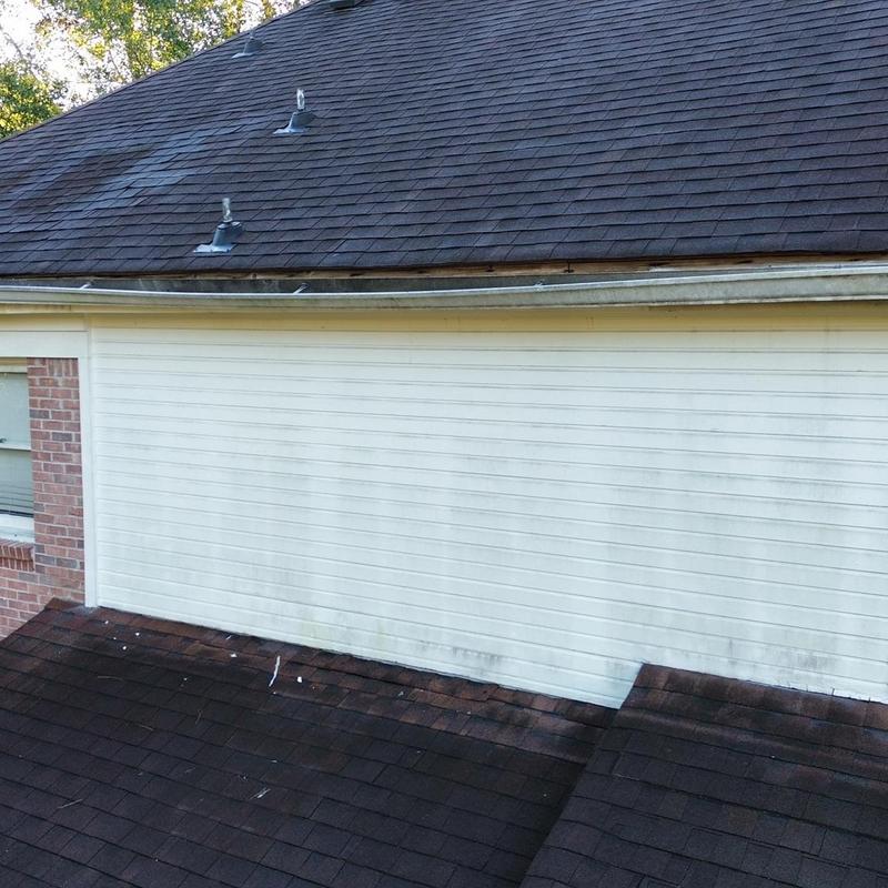 Empire Roofing and Restoration inspected a roof in Stone Mountain, Georgia. The team identified worn architectural shingles and multiple leaks. They found a damaged rear gutter causing water to overflow onto the roof. Technicians recommended cleaning all gutters and re-flashing two walls to address the flashing failure from water intrusion.
