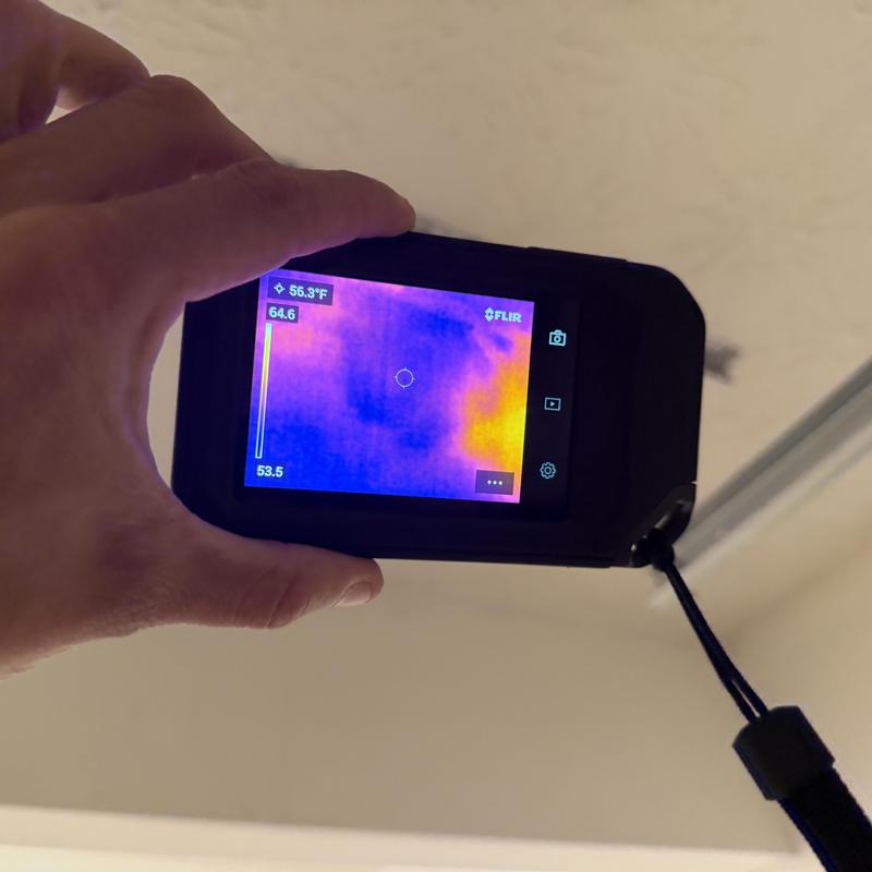 Empire Roofing and Restoration inspected a roof in Marietta, Georgia. The team identified an active interior leak using thermal imaging. They traced its likely source to a master bathroom above the affected area and recommended plumbing inspection. They also sealed deteriorating caulk around mechanicals and ridge cap nails during a general roof inspection.