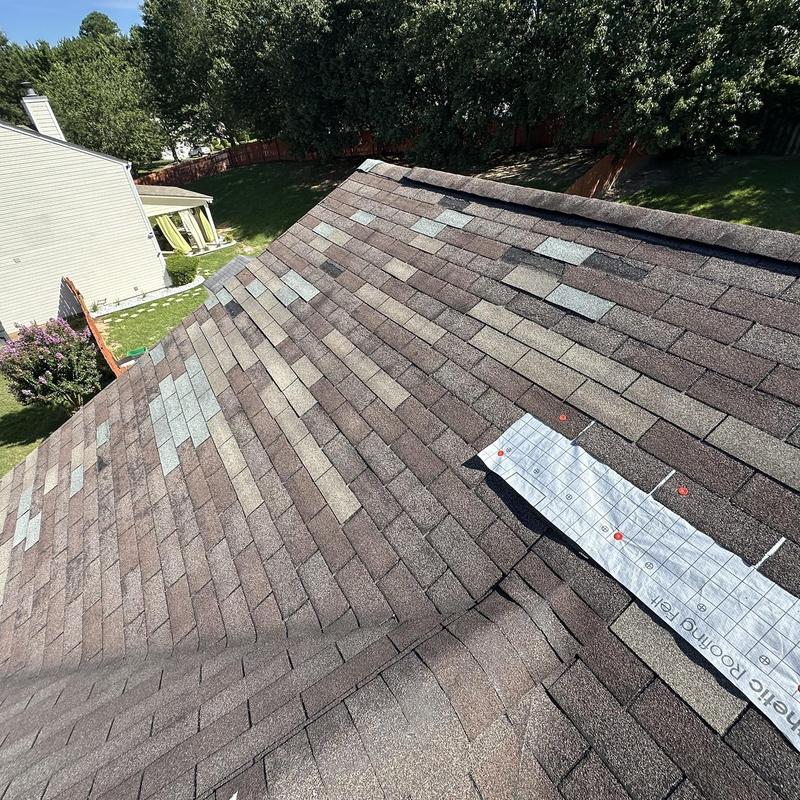 Empire Roofing and Restoration repaired a roof in Dawsonville, Georgia. The crew replaced missing and damaged shingles on the backside and sealed all mechanicals. They secured a tarp over exposed underlayment to prevent water intrusion before completing the shingle repair.