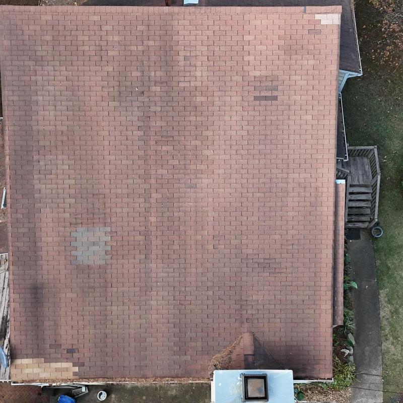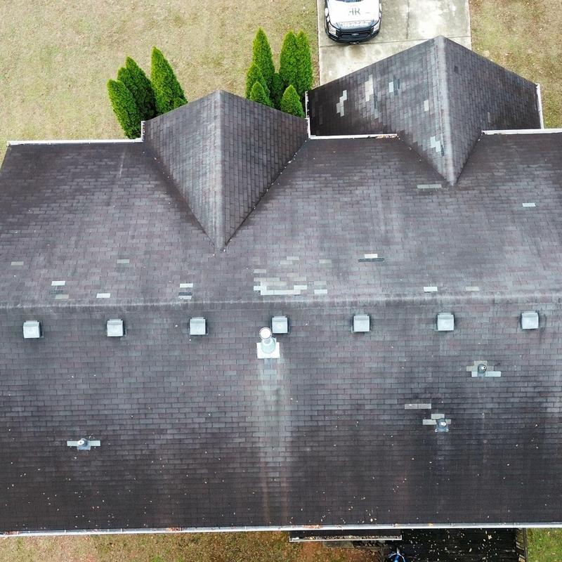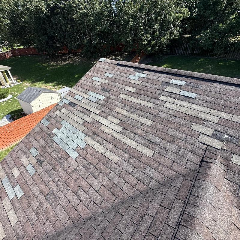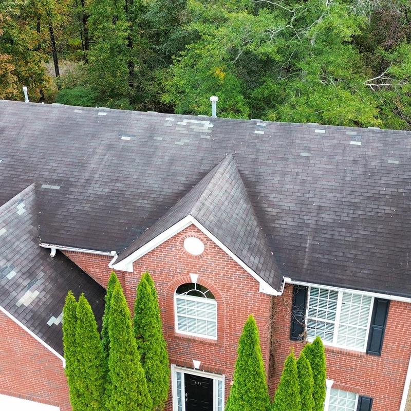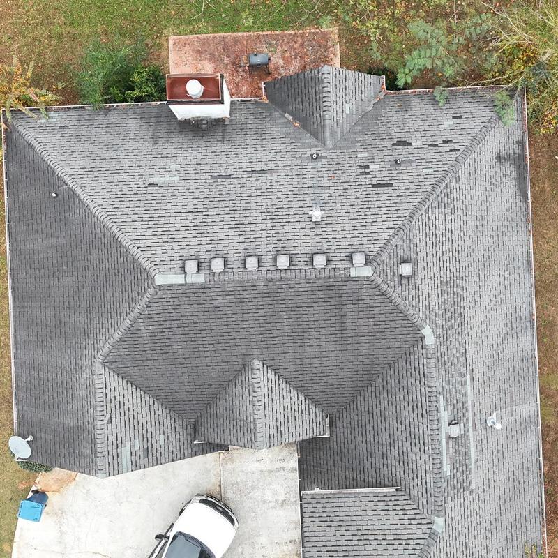 Empire Roofing and Restoration inspected a 3-tab Weathered Wood roof in Loganville, Georgia, and found several missing shingles. The team identified areas needing repair to help maintain the roof's function and prevent further damage.