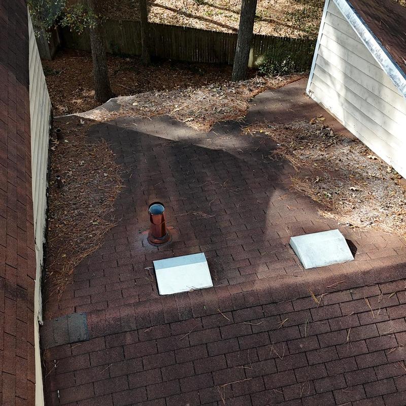 Empire Roofing and Restoration inspected a roof in Snellville, Georgia. The team identified a roof leak caused by a clogged dryer vent and recommended professional duct cleaning. They also sealed exposed ridge cap nails and caulked all mechanical penetrations on the roof to prevent further issues.