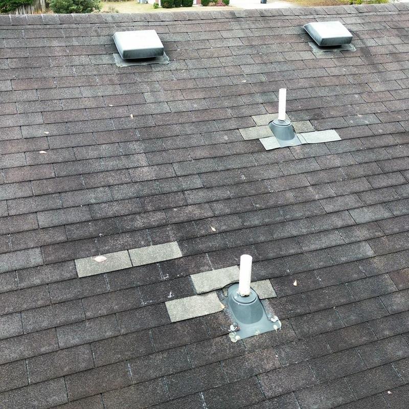Empire Roofing and Restoration inspected a roof in Loganville, Georgia, and found missing shingles exposing underlayment. The team installed a tarp to block water entry, then returned to replace the shingles and seal all mechanical areas with caulk.
