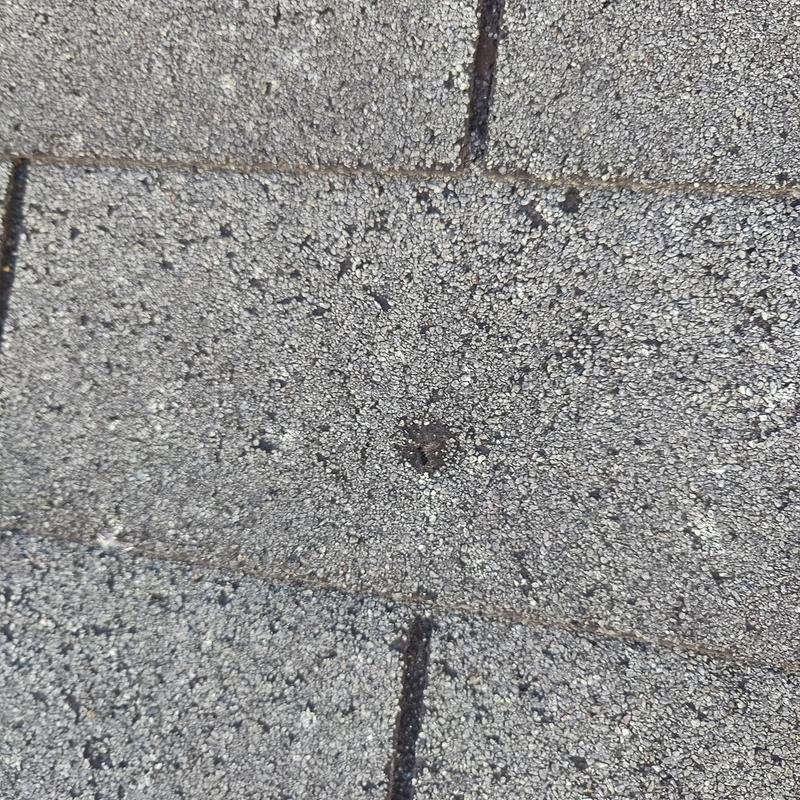 Empire Roofing and Restoration inspected a roof in Gainesville, Georgia. The team identified a leak caused by a small hole in the shingles. They installed a tarp to stop water entry, then returned to replace the damaged shingles and seal surrounding mechanicals with caulk.